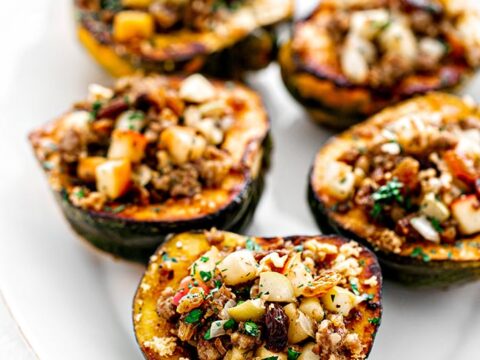 We love using acorn squash in a variety of recipes throughout the summer and fall months when they’re prevalent at the local farmers market. They are easy to get year round in the grocery store but there’s just something extra tasty about those fresh local ones!