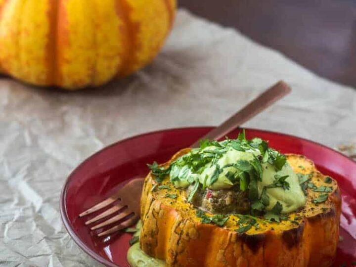 Healthy Southwest Stuffed Acorn Squash features a flavorful and healthy meatball with pinions, cilantro, cumin, and green chile stuffing a thick slice of sweet acorn squash... It gets a dollop of avocado crema and more cilantro. Delicioso!