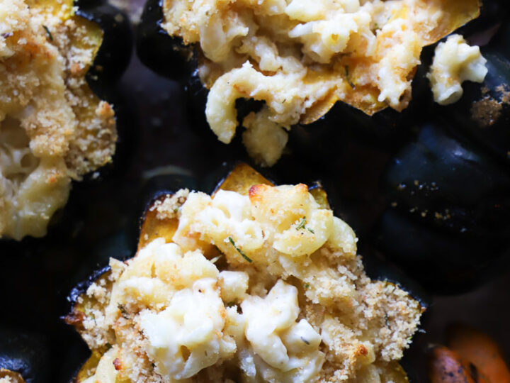 Roasted acorn squash stuffed with cheesy, creamy gouda mac and cheese! These acorn squash bowls are perfect for celebrating fall.
