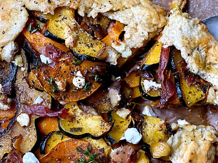 This rustic acorn squash galette has a flaky buttery crust, a sweet-savory filling with goat cheese, prosciutto, and chestnuts, and is served with a drizzle of maple syrup. Makes a perfect fall meal paired with a green salad.