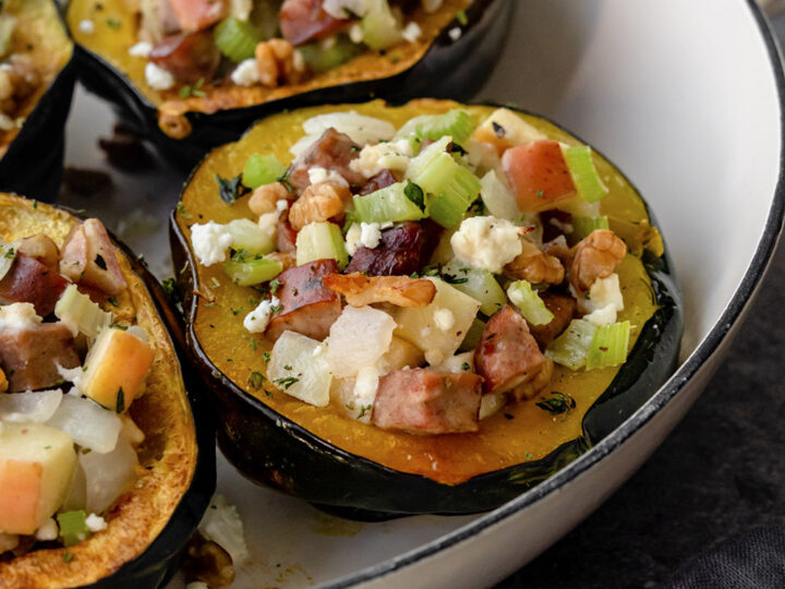 Sausage Stuffed Acorn Squash is full of Italian Sausage, fresh vegetables, and crisp Granny Smith apples, all topped with shredded white cheddar cheese. The sweet, nutty flavor of the squash with the spice from the Italian Sausage make this the ultimate weeknight dinner or serve as a hearty holiday side dish.