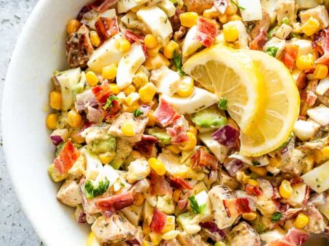 An easy egg salad recipe with avocados, chicken, corn, bacon, and a creamy lemon dill dressing.