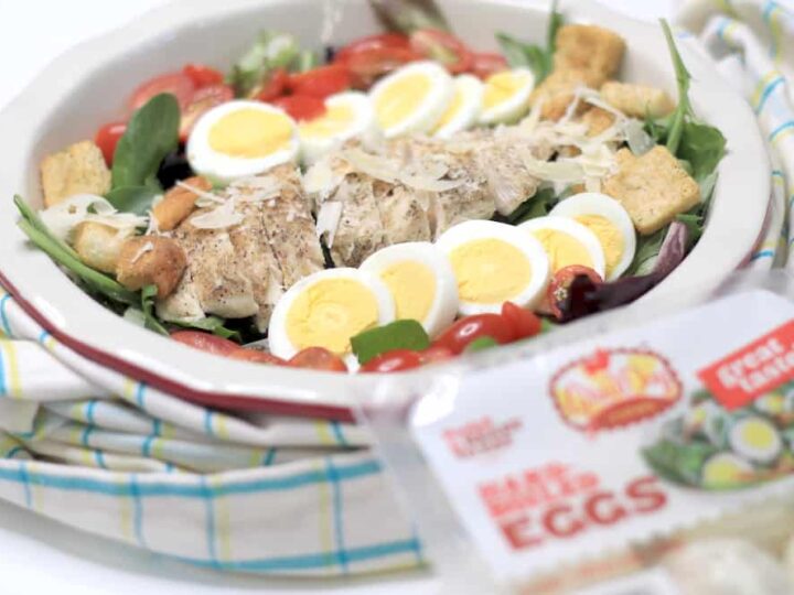 This quick and easy salad is filled with protein with hard-boiled eggs and grilled chicken.
