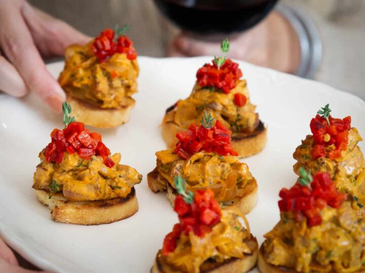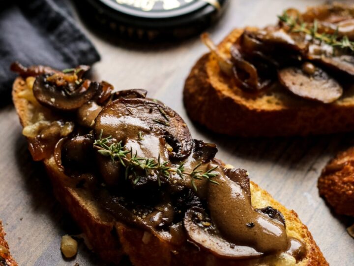 These festive vegan mushroom crostini recipe is an easy and impressive appetizer perfect for holidays. Crunchy baguette with grilled vegan mozzarella topped with sweet caramelized onions and mushrooms with a hint of balsamic and Dijon mustard will surely be a show stopper.