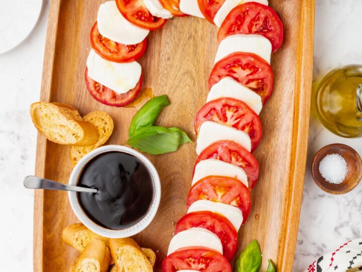 Need a simple appetizer for Christmas? This candy cane caprese salad is as delicious as it looks! Serve with some toasted baguette slices and balsamic glaze for a crowd pleasing appetizer.