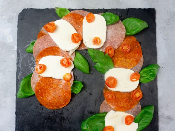 Candy Cane Charcuterie is the festive way to serve up some pepperoni, salami, and fresh mozzarella. Charcuterie the shape of a candy cane.