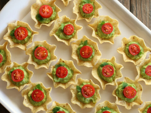 The red and green of these chip and guacamole bites make it perfect as a gluten-free Christmas appetizer to bring to their holiday parties. Much more fun than showing up with just chips and guacamole!