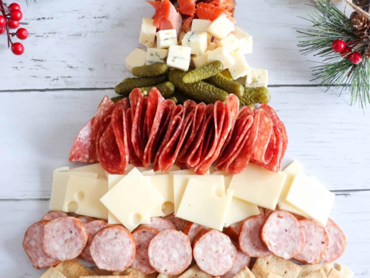 This Christmas tree charcuterie board is the perfect appetizer for the holidays. Not only is it delicious but it’s also easy to make this festive charcuterie board!