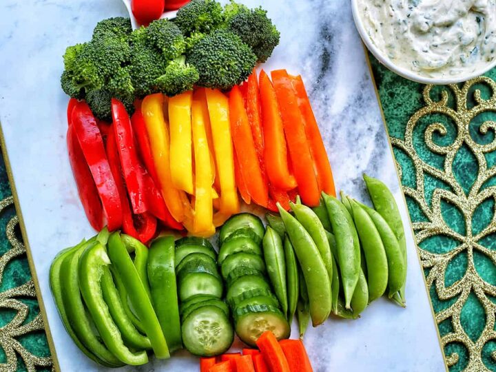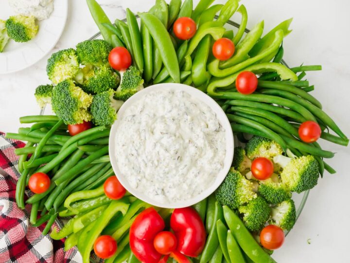 This Christmas wreath veggie tray is super easy to make this holiday season with just a few simple vegetables and your favorite dipping sauce!