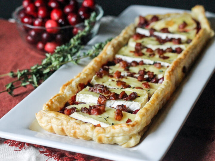 This Cranberry Brie Tart with Pancetta & Thyme is a delicious, easy appetizer that’s perfect for the holiday season! It’s a tasty twist on a traditional baked brie. It’s easy to make, too!