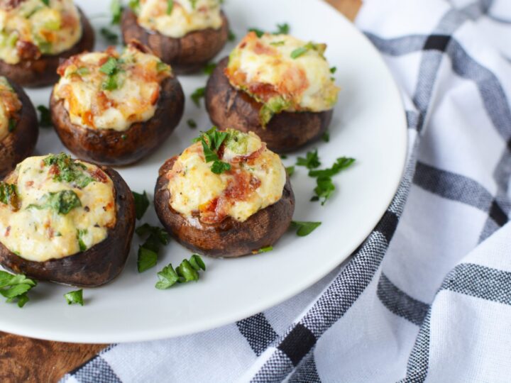 These Bacon and Fontina Cheese Stuffed Mushrooms are a delicious bite-size appetizer option. Only a few strips of bacon and one pound of mushrooms are needed, making it a budget-friendly holiday appetizer.