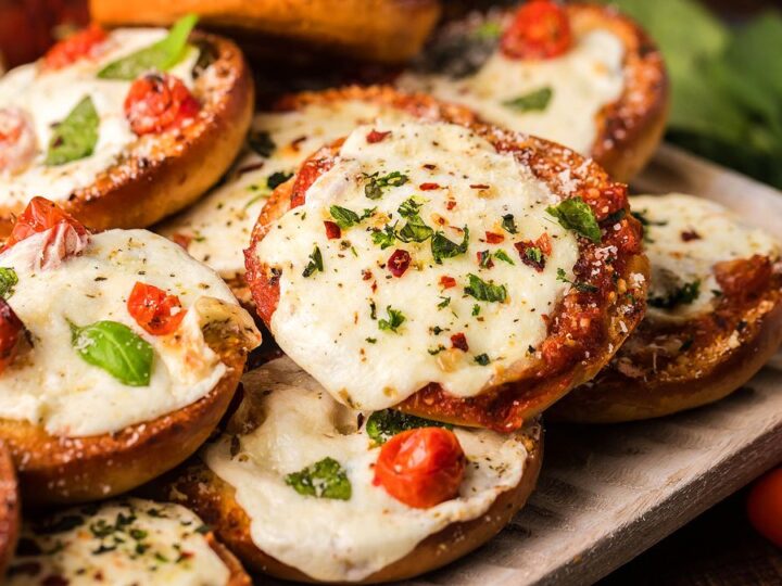 Mini pizza bagels combine cute mini bagels with garlic, Italian seasoning, tomatoes, marinara, mozzarella, and more. This is an Italian inspired recipe which features fresh flavours and a mouth-watering crunch.