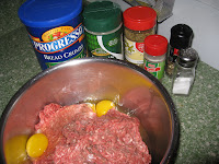- In a large bowl, mix the remainder of your meat (mine was approximately 2 lbs. worth) with four eggs, about 1 cup of bread crumbs, a 1/2 cup of