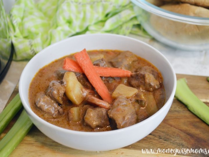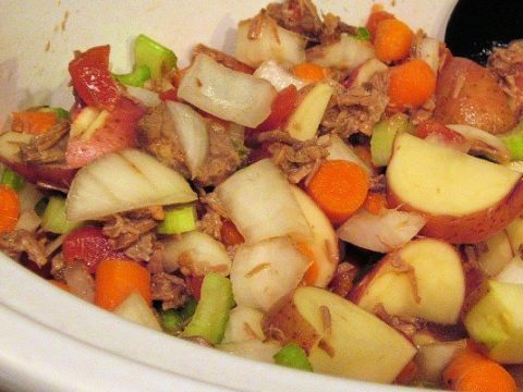 beef stew meal in black crock pot