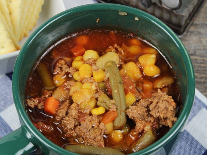 Beef and vegetable soup in white crock - crockpot soup recipes
