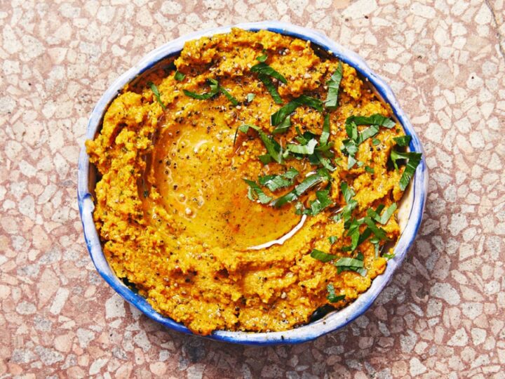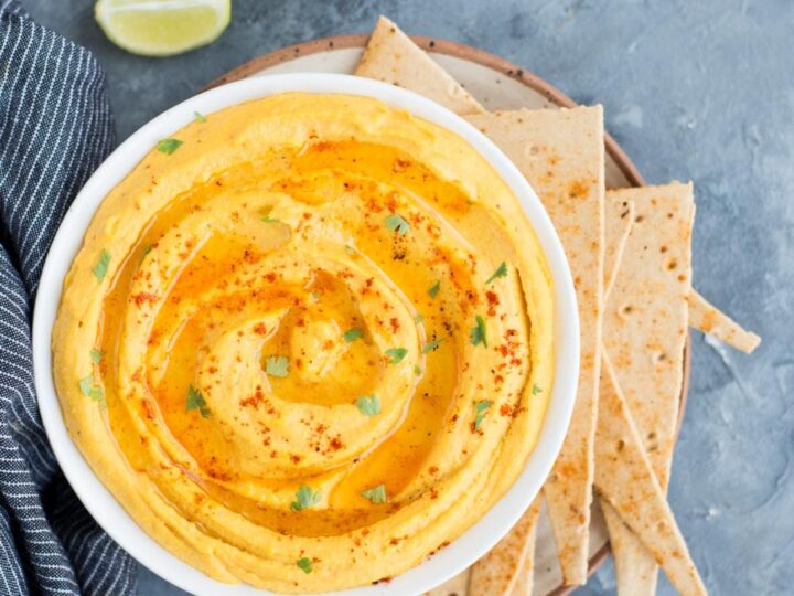 This Pumpkin Hummus is creamy and delicious, with a surprising savory spicy kick that comes from Thai red curry paste. Make this easy appetizer dip from scratch in under 30 minutes.