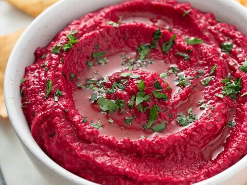 Super creamy roasted beet hummus is slightly sweet, lemony, garlic-y, healthy, so delicious, and ridiculously gorgeous! Perfect dip served with sliced veggies or pita chips for an awesome snack or appetizer that will wow the pants off of everyone!