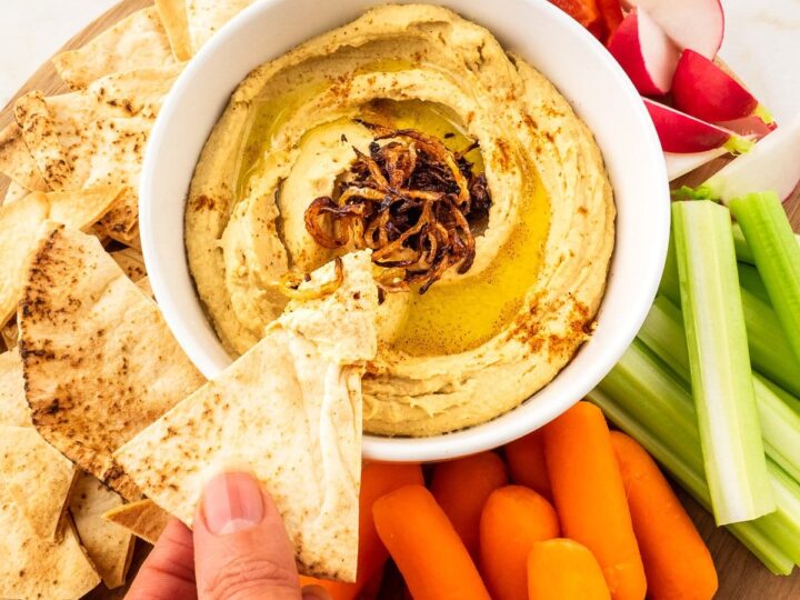 This homemade Caramelized Onion Hummus is savory and creamy. Serve it with vegetables, pita or tortilla chips, for a delicious and healthy appetizer or snack!
