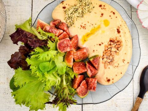 This fresh hummus dip recipe combines hemp seeds, figs, olive oil, and greens with chickpeas for a healthy dairy-free dip everyone will love.