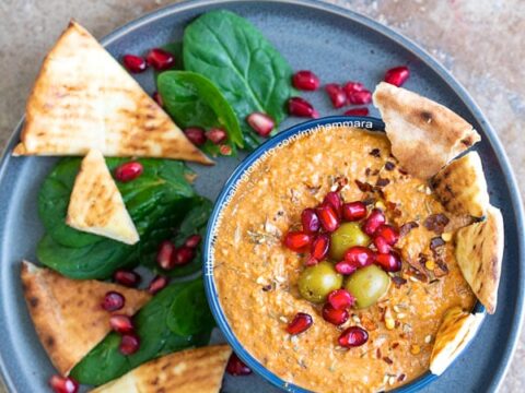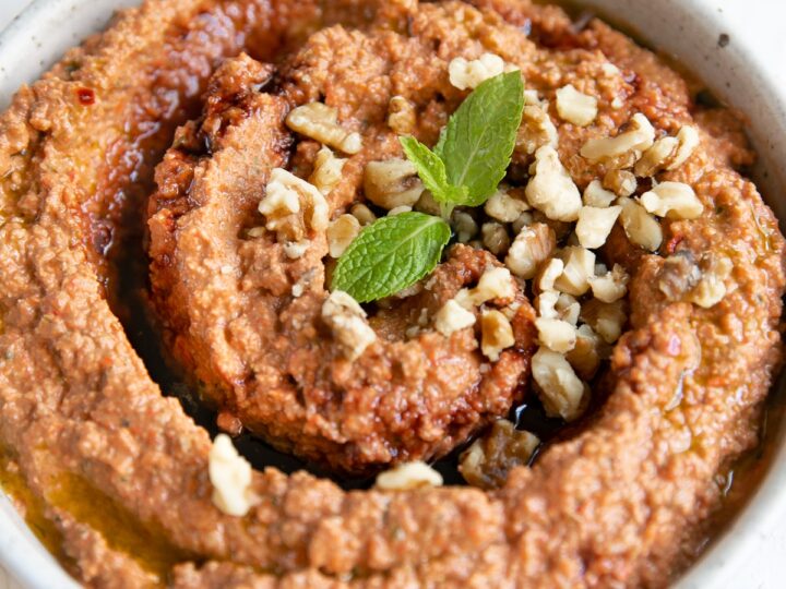 Muhammara is a Middle Eastern dip traditionally made from roasted red peppers, ground walnuts, Aleppo peppers, breadcrumbs, and pomegranate molasses. Sweet, tangy, smoky, and a little spicy, this post provides an easy muhammara recipe with step-by-step instructions to make this easy and delicious appetizer at home!
