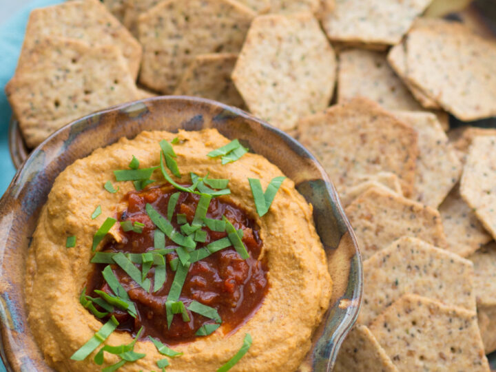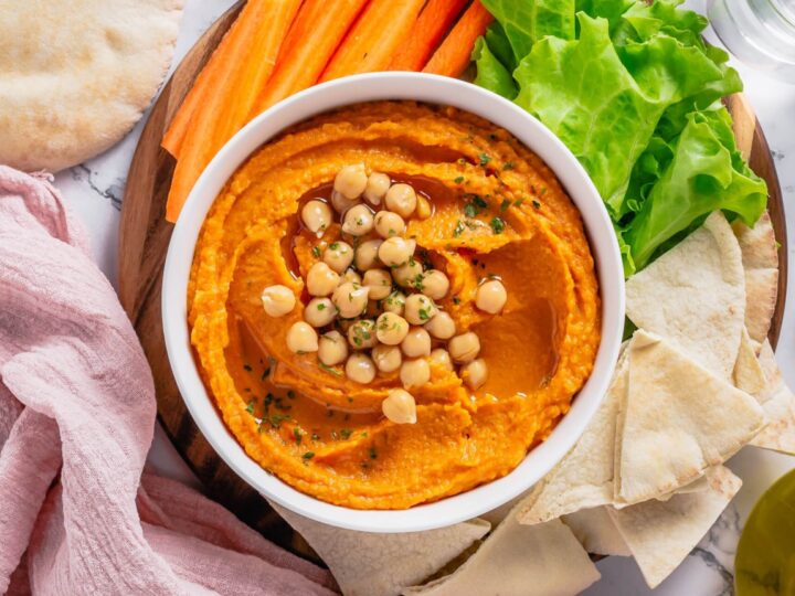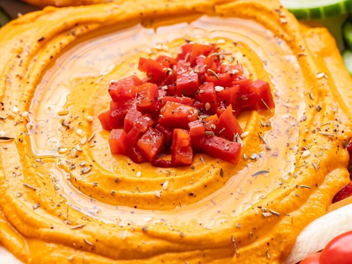 Roasted Red Pepper Hummus is so easy to make at home! Made with sweet roasted red bell peppers, chickpeas, tahini, lemon juice, garlic, and spices. It’s perfect for snacking or serve it as an appetizer!