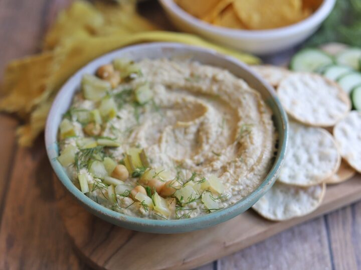 There's so much briny flavor & crunch in this dill pickle hummus.