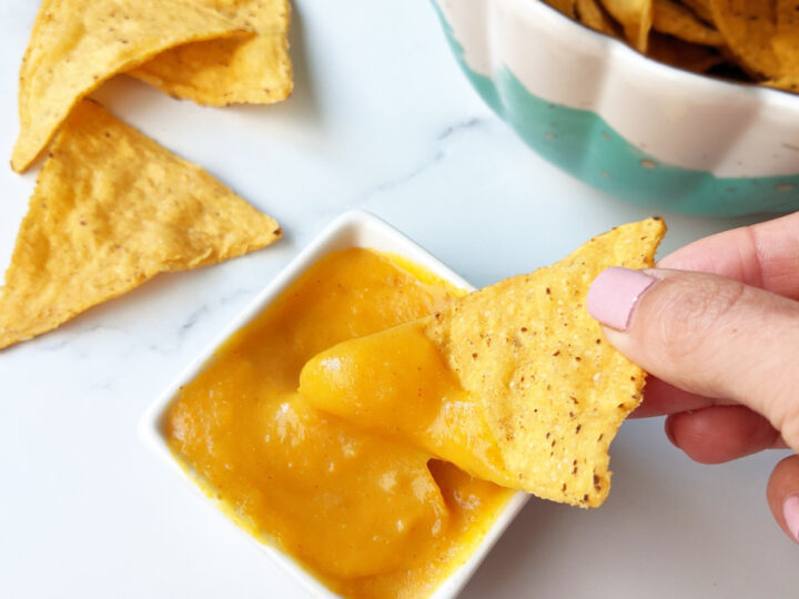 This dairy-free nacho cheese sauce is a delicious dip that everyone can enjoy! It has the perfect combination of flavors and is oil and nut free!