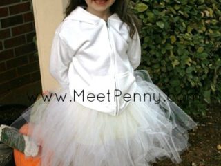We used a Halloween tee that my daughter already had, black leggings, and embellished a witch’s hat with leftover tulle. Since we had the hat in our dress-up box, this costume cost less than $7.00!