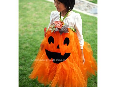 Craft Passion used orange tulle for this pumpkin costume. By adding green ribbon around the waistband and black felt accents for the face, it's a very cute interpretation of a Jack o' Lantern.
