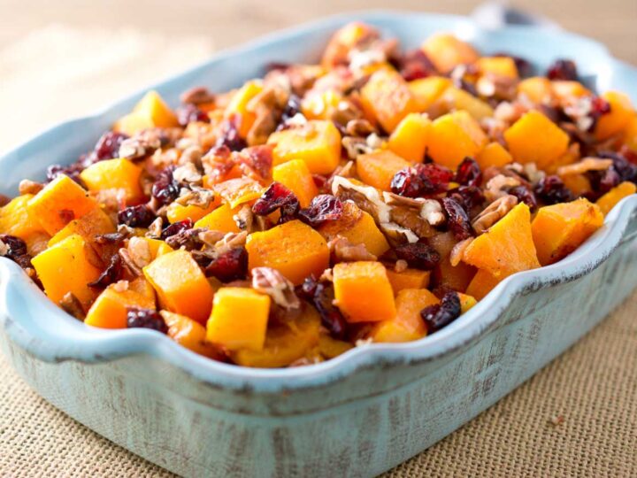 Oven roasted butternut squash with cranberries and feta is a great side dish for any fall meal. This recipe is so simple, and the results are delicious.