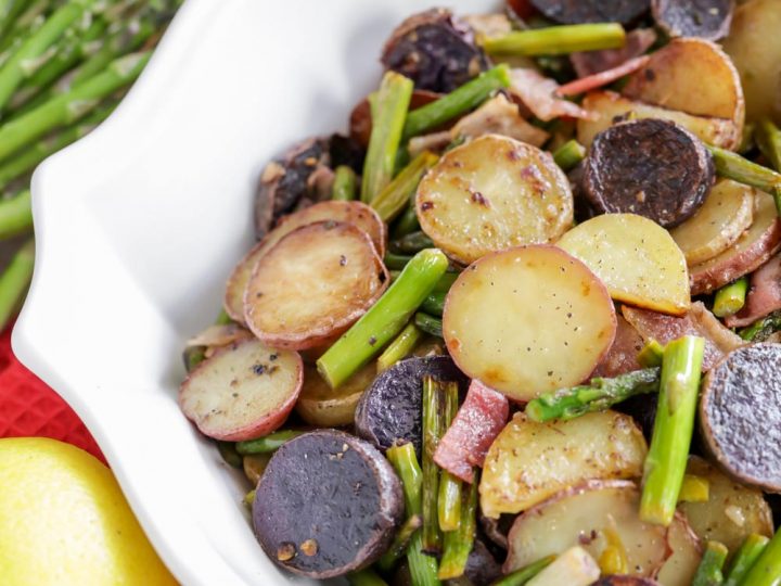 If you're looking for lighter fare than traditional mashed potatoes and stuffing, this Asparagus and Tater Toss is just right! It's quick to make with tiny fingerling potatoes.