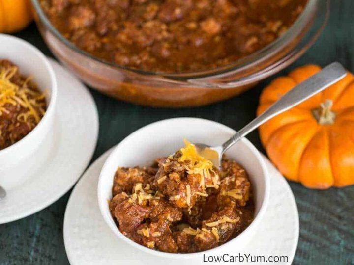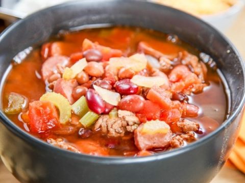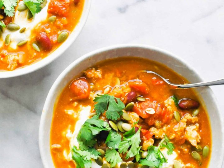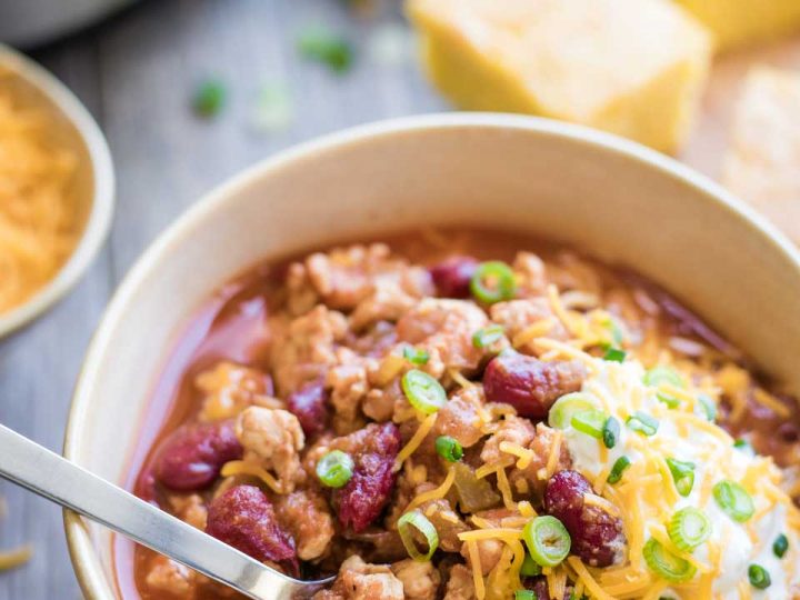 A look at a bowl of finished ground turkey crokpot chili ready to eat.
