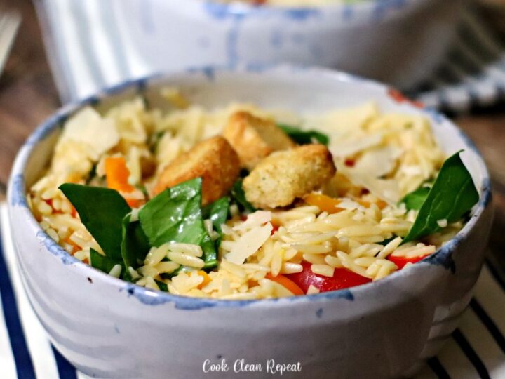 This orzo pasta salad is easy to make, delicious, and perfect for parties and family gatherings. It's great for a quick lunch or dinner on the go and it pairs well with your favorite protein to make a whole meal.