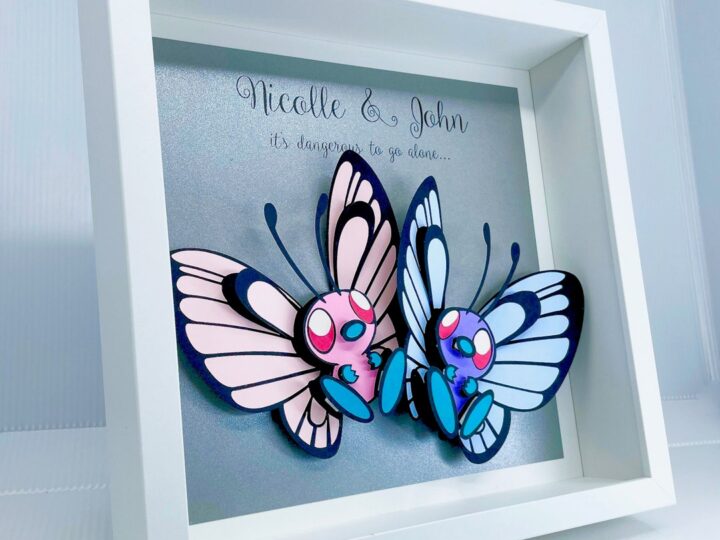 This personalized Pokemon-themed shadow box is adorned with intricate handmade paper Pokémon butterflies. Customizable to fit your memories, it comes in three distinct sizes - a square 12" x 12", a rectangular 8" x 10", or a compact 9" x 9", each in a classic black or white finish.