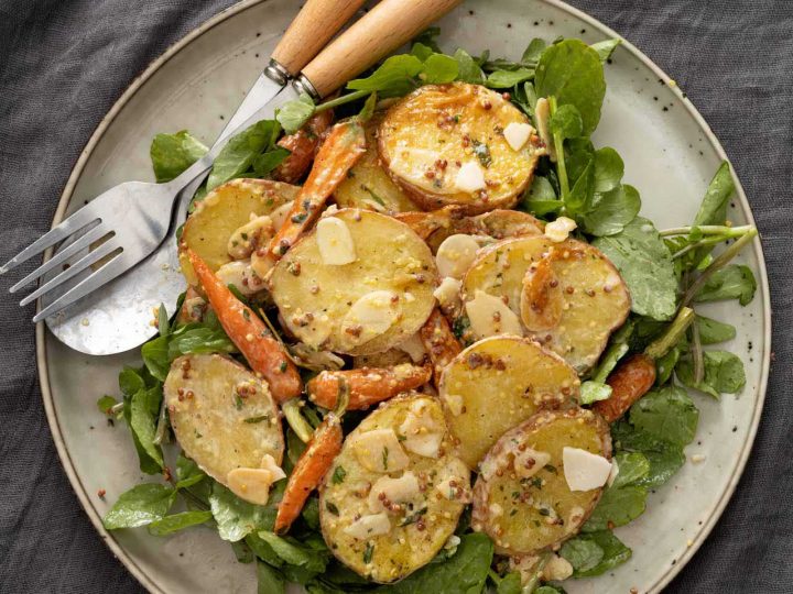 This mustard potato salad is a quick side featuring sliced potatoes, carrots, and a vinegar-mustard dressing. It packs delicious flavors and is easy to prepare for picnics, barbecues, and parties!