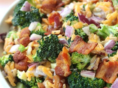 You will find this Creamy Broccoli Salad loaded with bacon, red onion, cheese, and a delicious dressing. It’s a perfect side dish for any meal and also great for summer potlucks and bbqs.
