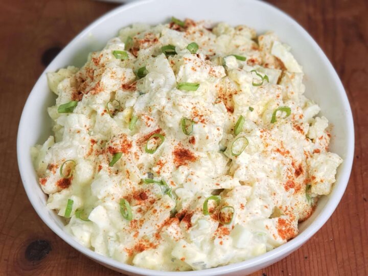 Make easy LOW CARB Cauliflower Potato Salad for your next BBQ. Keto, paleo, gluten-free, whole 30, healthy and best of all, it’s a crowd pleaser!