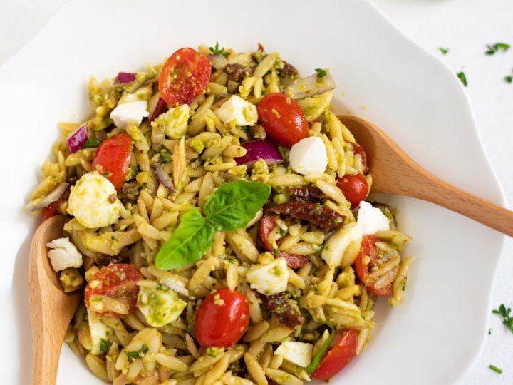 Sun-Dried tomatoes, basil leaves, and fresh mozzarella make this Pesto Orzo Salad a summer favorite. It’s fresh, flavorful, and so easy to make! Perfect for a picnic, potluck, or weeknight meal.