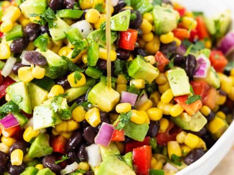 If you are trying to live by the motto, eat the rainbow, then this Bean Salad is definitely for you! The red or yellow cherry tomatoes, the black beans, the green cilantro and parsley, and bright yellow corn make this salad an explosion of color.