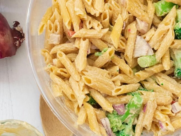 When spring and summer are in full swing, this sweet broccoli apple salad with pasta makes the perfect side dish for all your BBQ’s, potlucks. This healthy but still creamy side dish is fresh and deliciously full of sweet honey crisp apple, carrots, broccoli and raisins all mixed with pasta.