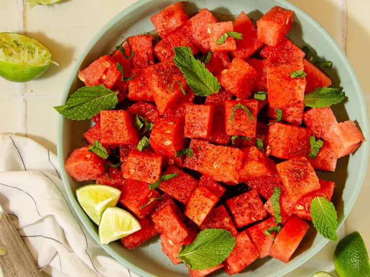 This Tajin Watermelon Mint Salad is the most refreshing and light side dish salad. 15-minutes and easy to make-ahead. Naturally vegan, paleo, Whole30.