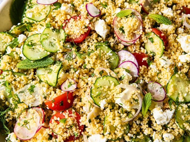 This delicious couscous salad, loaded with fresh herbs, crunchy vegetables and briny feta, pulled together by a lemony salad dressing, is absolutely perfect for your summer picnics and barbecues!