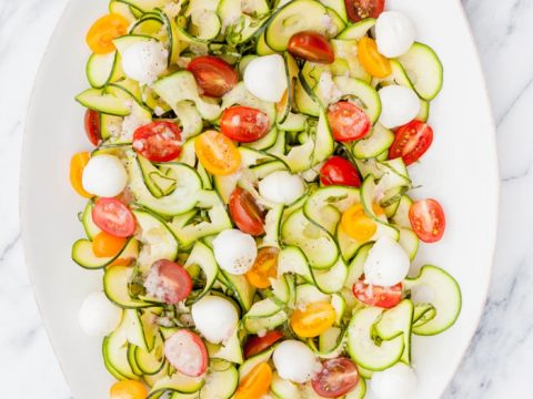 This Zucchini Tomato Basil Salad with Lemon Basil Vinaigrette is a light and refreshing summertime salad and perfect when your garden is exploding with tomatoes, basil, and zucchini in the later summer months.