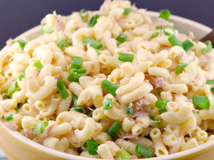 A simple 4 ingredient Tuna Macaroni Salad that can be thrown together last minute or made ahead. It's served cold so is perfect for feeding a crowd, or bringing along to a potluck, picnic or BBQ!
