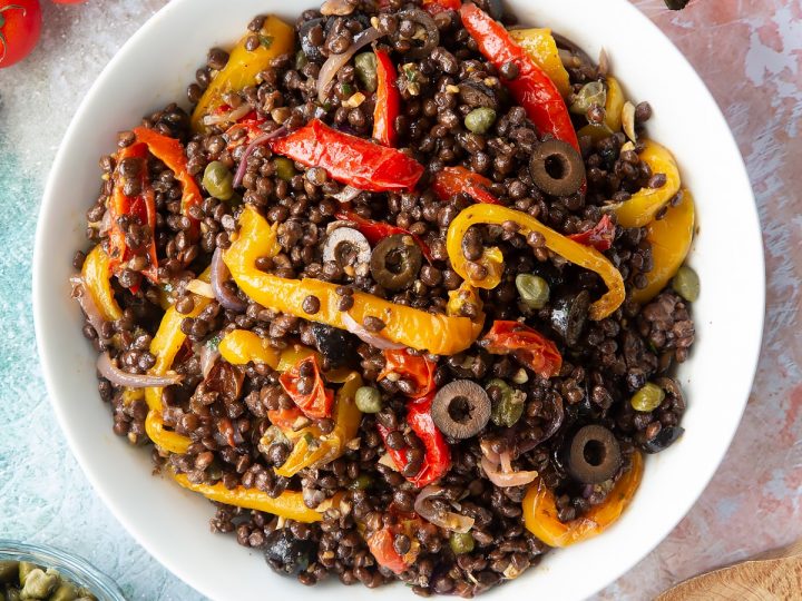 Earthy puy lentils, roasted cherry tomatoes, red onion and sweet peppers, salty black olives and piquant capers make up this delicious and colourful vegan lentil salad.