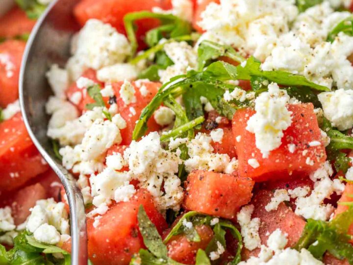 This watermelon salad with arugula and crumbled feta is the best summer salad ever! It’s sweet and savory at the same time, it’s super light, refreshing, and very satisfying. This salad may be unusual, but it’s so delicious and really simple to make.