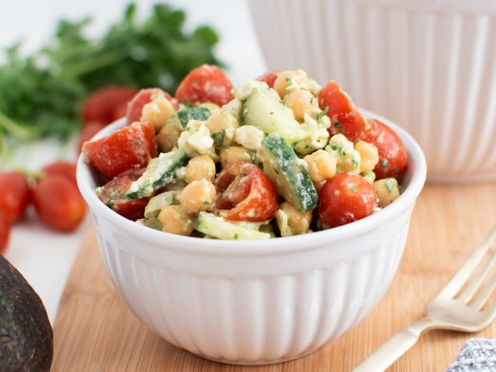 Cilantro Chickpea Salad is loaded with chickpeas, avocado, tomato, cucumber, and feta, all tossed with a delicious cilantro-lime vinaigrette. It’s a light and fresh salad that’s perfect for your summer potluck or picnic!
