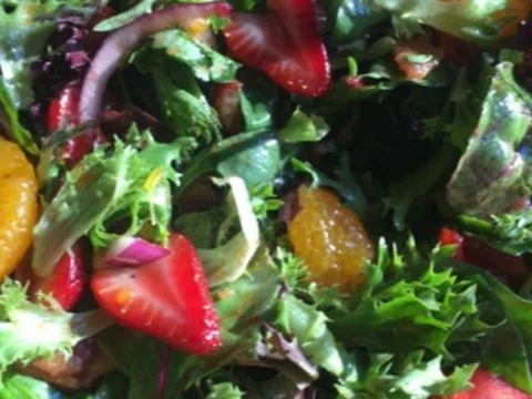 This easy tossed salad combines strawberries, mandarin oranges, almonds, greens, and a few onions in a light, tangy citrus dressing.