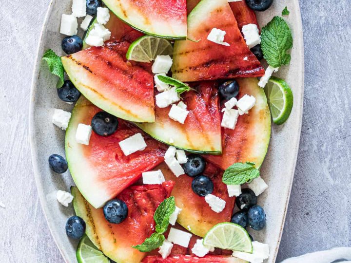 Sweet, colorful, and fresh Grilled Watermelon Salad with feta and blueberries is ready in under 20 minutes and makes an easy side dish for Memorial day celebrations, hot summer days or every day.