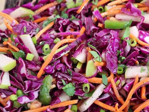 A crunchy & refreshing red cabbage coleslaw mixed with carrot, apple, jalapeno, cilantro & green onion then tossed in a tangy & slightly sweet apple cider vinegar dressing. Use this easy & healthy slaw as a simple side dish with your favorite main course.